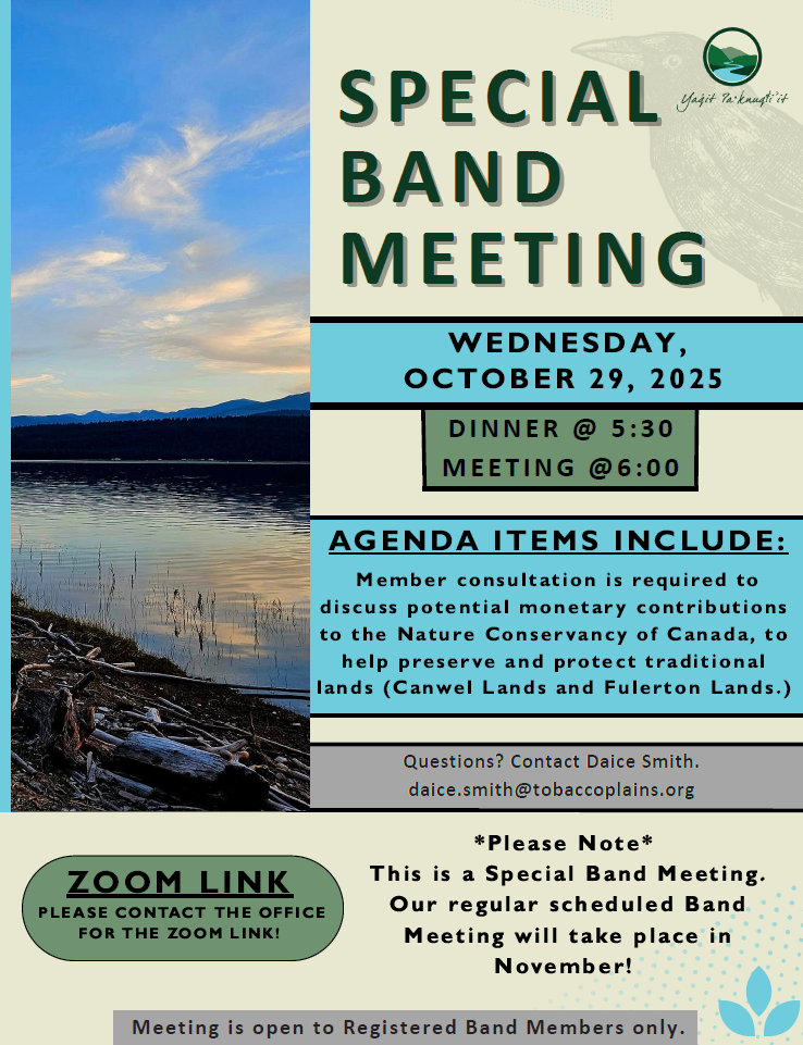 Join us on Wednesday, October 29th at 5:30 pm for a Special Band Membership Meeting to discuss potential monetary contributions to the Nature Conservancy of Canada to help preserve and protect traditional lands (Canwel and Fulerton Lands).